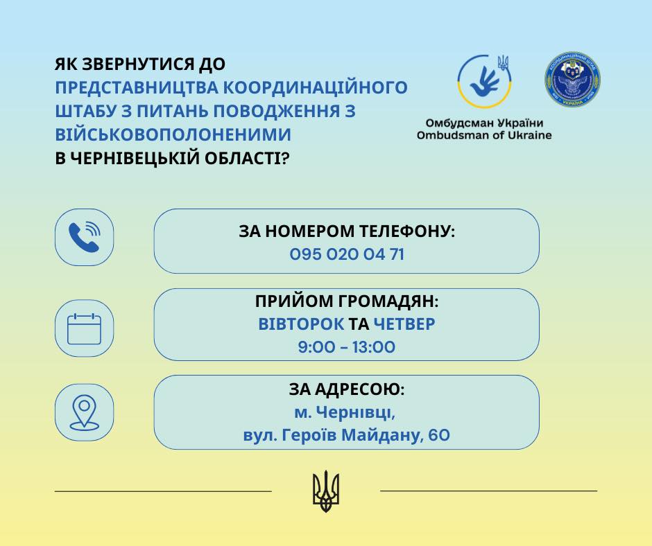Якщо ваш рідний або близький – військовослужбовець – перебуває у полоні або зник безвісти за особливих обставин, важливо знати: ви не залишаєтеся з цим наодинці. У Чернівецькій області на базі Центру захисту прав людини у місті Чернівці функціонує представництво Координаційного штабу з питань поводження з військовополоненими, яке надає інформаційну, правову та організаційну підтримку родинам оборонців України.