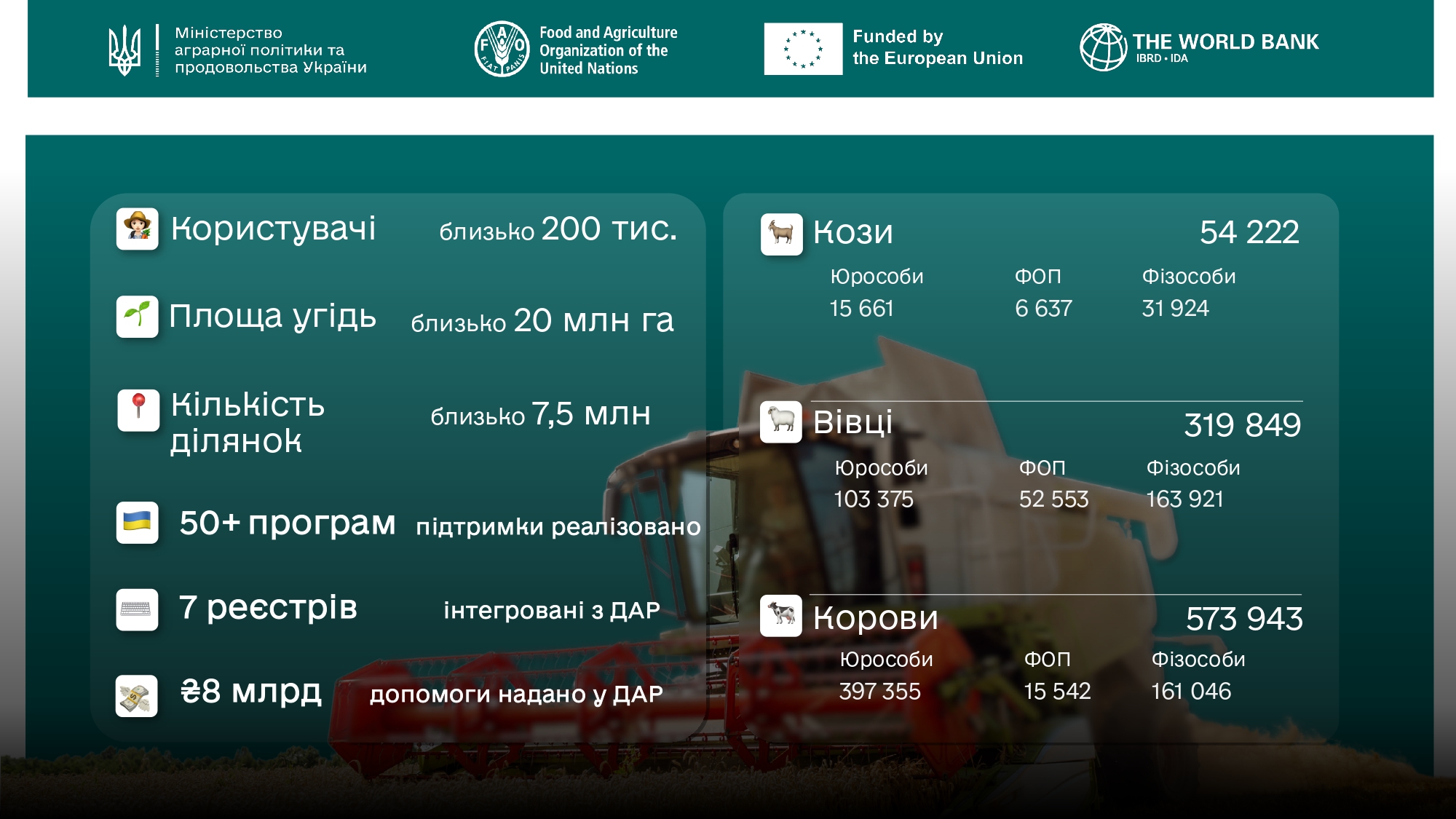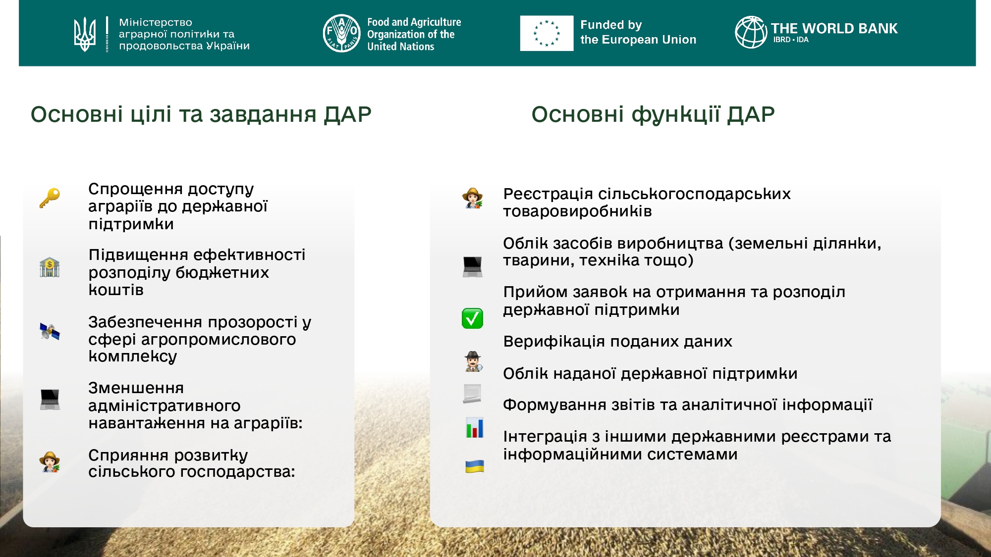 Впровадження ДАР відбувається за підтримки Європейського Союзу, Продовольчої та сільськогосподарської організації ООН (FAO) та Світового банку.