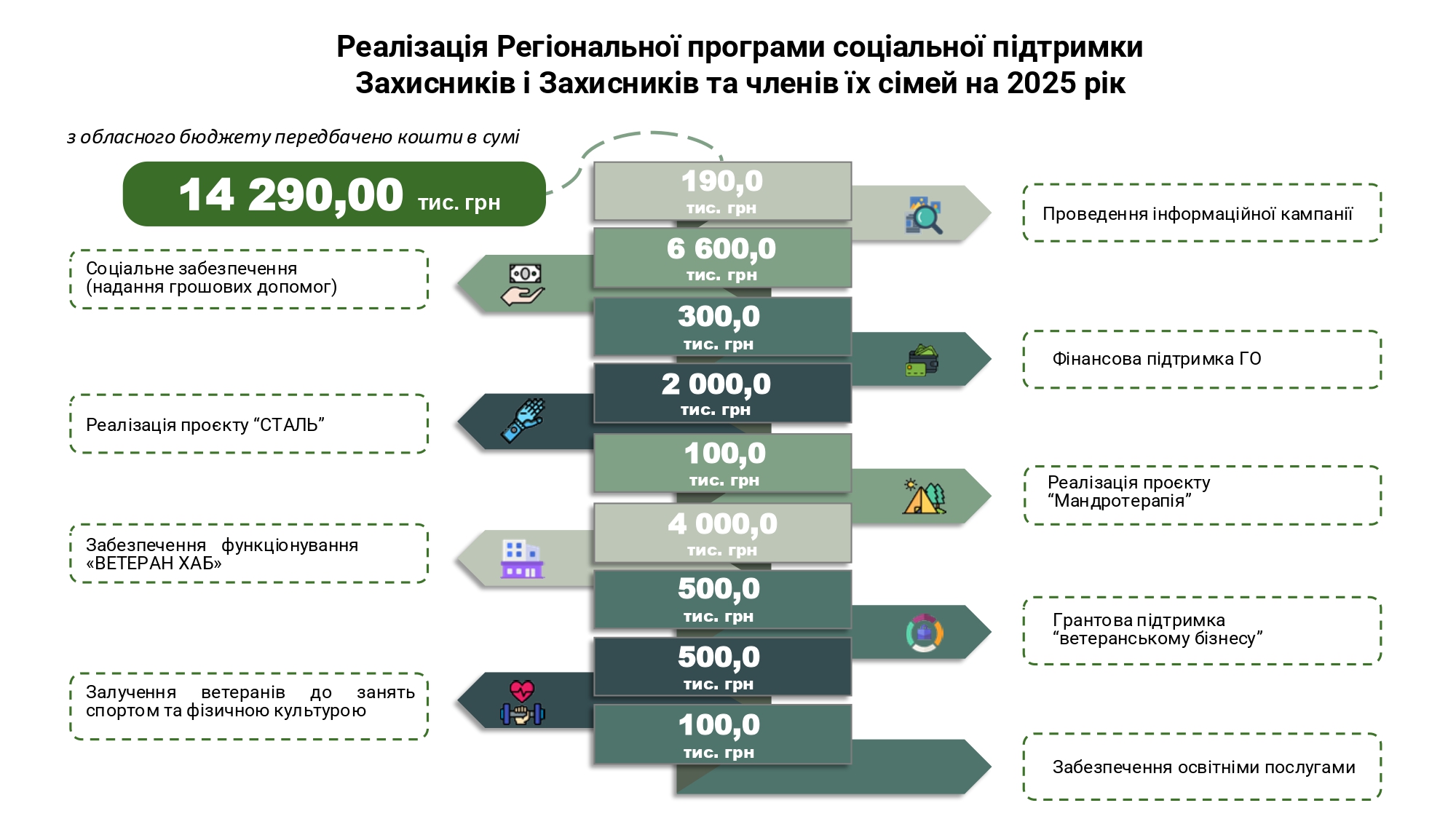 У 2025 році на реалізацію Регіональної програми соціальної підтримки Захисників і Захисниць та членів їхніх сімей передбачено 14,29 млн грн з обласного бюджету. Кошти будуть спрямовані на широкий спектр заходів: